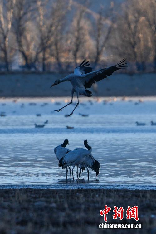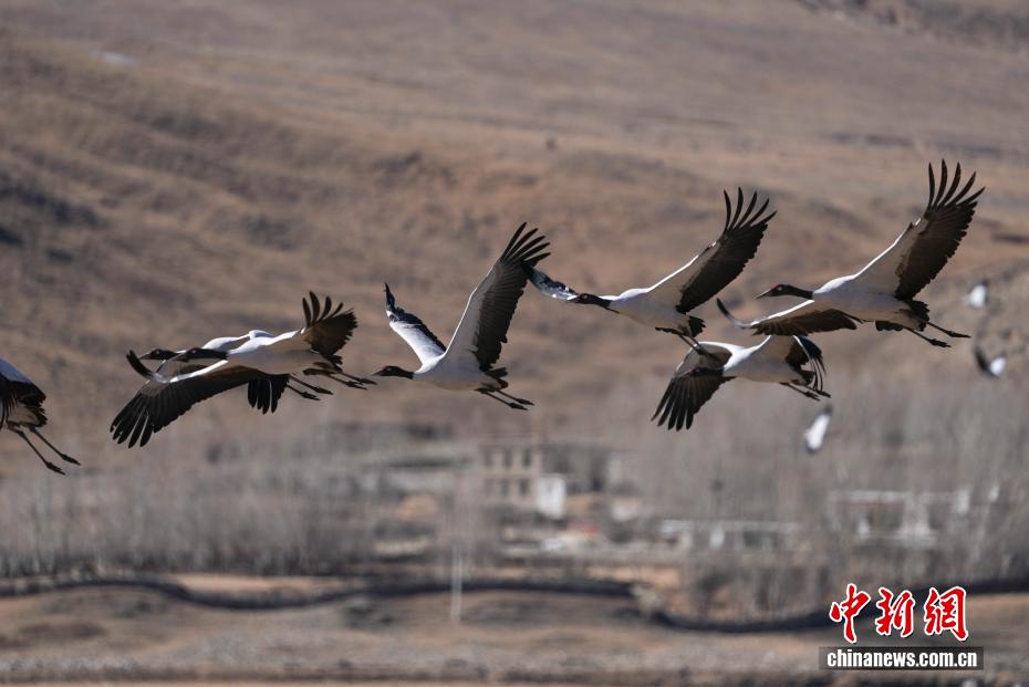 11月26日,位于西藏自治區(qū)拉薩市林周縣黑頸鶴自然保護區(qū)內(nèi),大批越冬黑頸鶴現(xiàn)身卡孜水庫及田間地頭,悠閑覓食、嬉戲。這些遠道而來的黑頸鶴,將在此棲息至次年三四月份。黑頸鶴為中國國家一級保護動物,也是唯一在高原生活、繁殖的鶴類。近年來,隨著當?shù)厣鷳B(tài)保護力度持續(xù)加大,前往林周縣越冬的黑頸鶴等候鳥數(shù)量逐年增多。圖為黑頸鶴在林周縣黑頸鶴保護區(qū)內(nèi)飛翔。貢確 攝