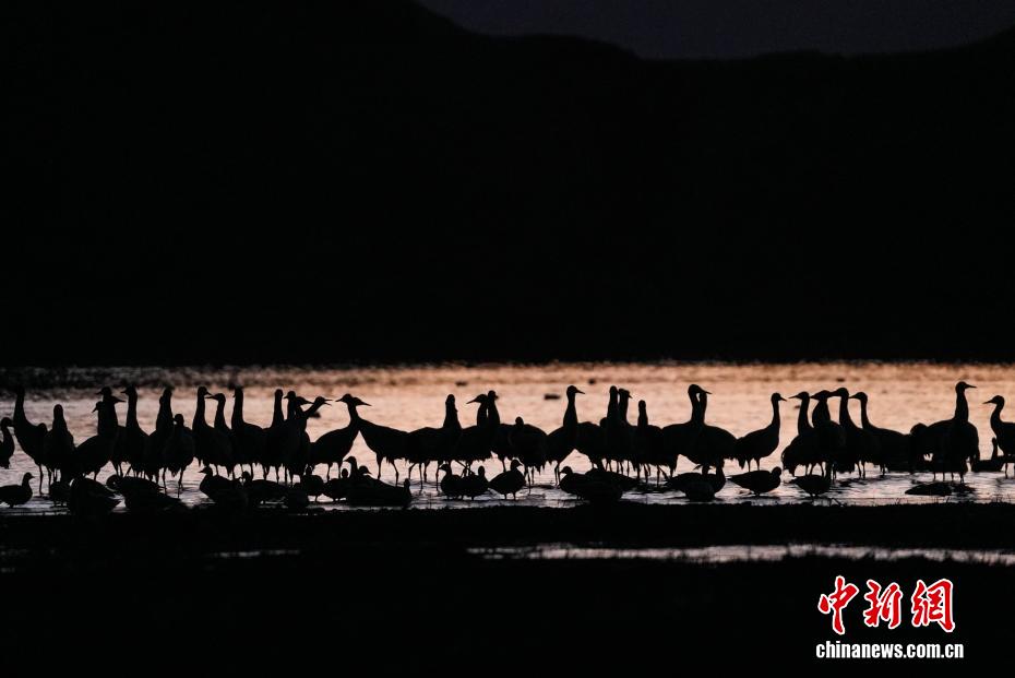 11月26日,位于西藏自治區(qū)拉薩市林周縣黑頸鶴自然保護區(qū)內(nèi),大批越冬黑頸鶴現(xiàn)身卡孜水庫及田間地頭,悠閑覓食、嬉戲。這些遠道而來的黑頸鶴,將在此棲息至次年三四月份。黑頸鶴為中國國家一級保護動物,也是唯一在高原生活、繁殖的鶴類。近年來,隨著當?shù)厣鷳B(tài)保護力度持續(xù)加大,前往林周縣越冬的黑頸鶴等候鳥數(shù)量逐年增多。圖為在林周縣卡孜水庫拍攝的黑頸鶴。貢確 攝