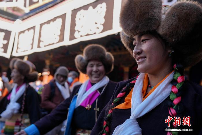 11月28日,隨著藏歷十月十五白拉姆節(jié)臨近,連日來,拉薩及周邊信眾身著色彩艷麗的藏裝節(jié)日盛裝,手持從家中精心準備的頭等青稞酒、新收的青稞及新鮮水果,陸續(xù)前往大昭寺、色拉寺、哲蚌寺等寺廟朝拜祈福。大昭寺內(nèi),信眾敬獻供品后載歌載舞,歌聲悠揚、舞步輕快,盡顯節(jié)日喜悅。白拉姆節(jié)又稱 “仙女節(jié)”。相傳,白拉姆是拉薩地區(qū)的保護神,是藏傳佛教最高護法神之一班丹拉姆的女兒。白拉姆曾與大昭寺護法神赤尊贊相互愛慕并私定終身,其母親班丹拉姆發(fā)現(xiàn)后,赤尊贊被趕到拉薩河南岸,每逢藏歷十月十五日,二人才能隔河相見一次。圖為白拉姆節(jié)臨近之際,信眾在大昭寺內(nèi)敬獻供品后載歌載舞的場景。貢確 攝