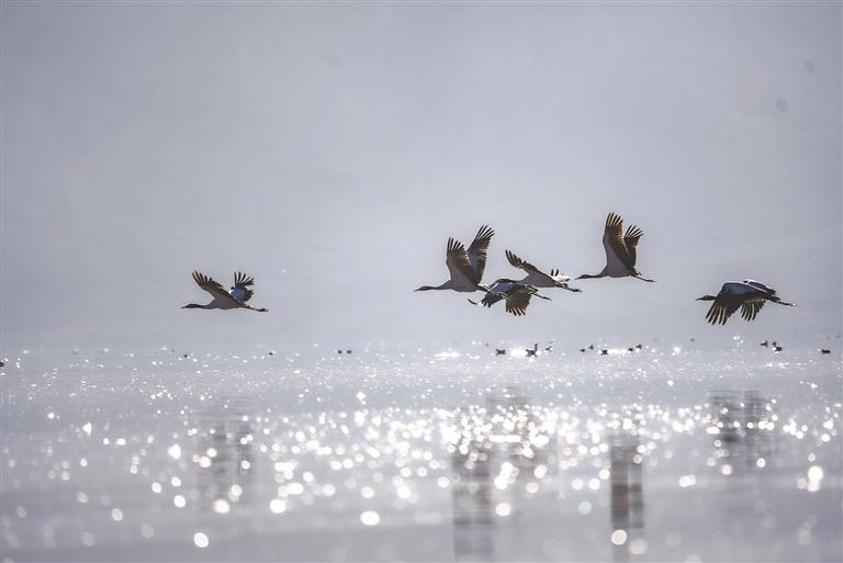 來到卡孜水庫,只見水面上薄霧未散,黑頸鶴的鳴叫聲劃破靜謐,那聲音清亮卻不刺耳,像帶著高原特有的通透感,時(shí)而短促清脆伴著水波蕩漾的輕響,似乎在訴說著高原的故事。循聲望去,幾只黑頸鶴正在湖面上悠然佇立,修長(zhǎng)的脖頸微微彎曲,倒映在平靜的水面上,宛如水墨畫卷中的靈動(dòng)筆觸;忽然間,幾只黑頸鶴率先舒展雙翼,寬大的翅膀劃破晨霧,腳掌蹬離水面時(shí)濺起細(xì)碎的水花,身姿矯健地朝著高空飛去,其余黑頸鶴也相繼展翅,追隨同伴的身影扶搖而上,朝著村落方向飛去。當(dāng)它們從錯(cuò)落有致的村民住房上空掠過時(shí),晨光恰好穿透薄霧,灑在灰褐色的羽翼上,下方屋頂升起裊裊炊煙,動(dòng)靜之間,勾勒出一幅人與自然和諧共生的鮮活圖景。