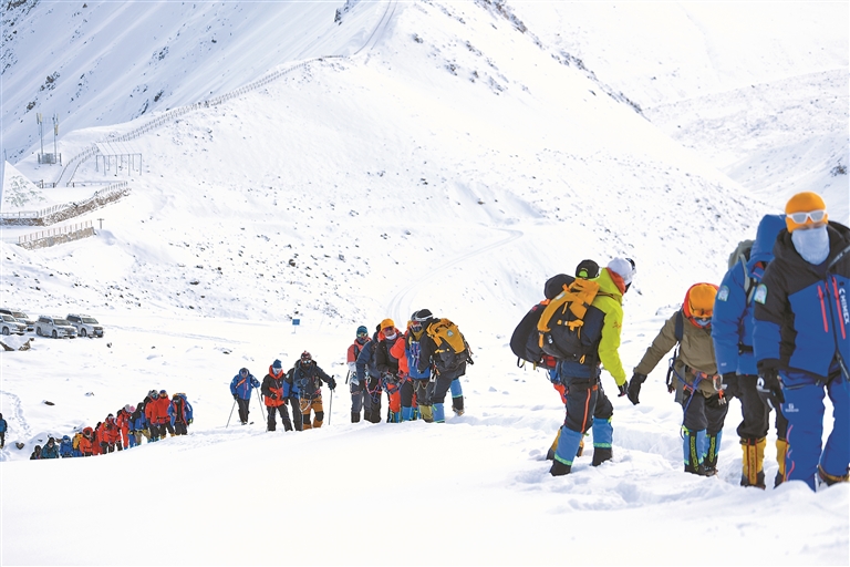 圖為5月2日,登山愛好者向洛堆峰峰頂進發(fā)(資料圖片)。本報記者 潘多 鄭璐 明吉 攝影報道