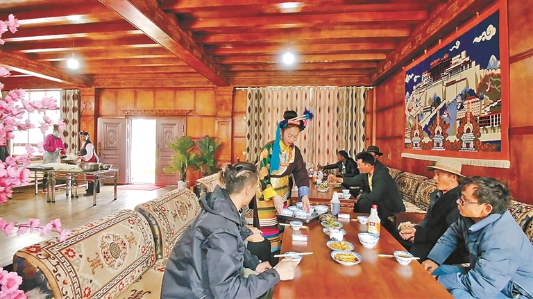 作為自治區(qū)級非遺傳承人、芒康縣“婦女致富帶頭人”的卓瑪拉姆,于2010年開辦鹽井果拉叢農(nóng)家樂,憑借著正宗的加加面風(fēng)味和熱情的服務(wù),逐漸積累了口碑。2012年,在各級政府的支持下,她采用“民族特色餐飲+鄉(xiāng)村旅游接待”的經(jīng)營模式,生意日益紅火。2017年,通過貸款300萬元、自籌160萬元翻建了農(nóng)家樂,將其升級為綜合型的民族特色餐飲店,經(jīng)營規(guī)模大幅擴大,最多時日接待游客達(dá)300余人。