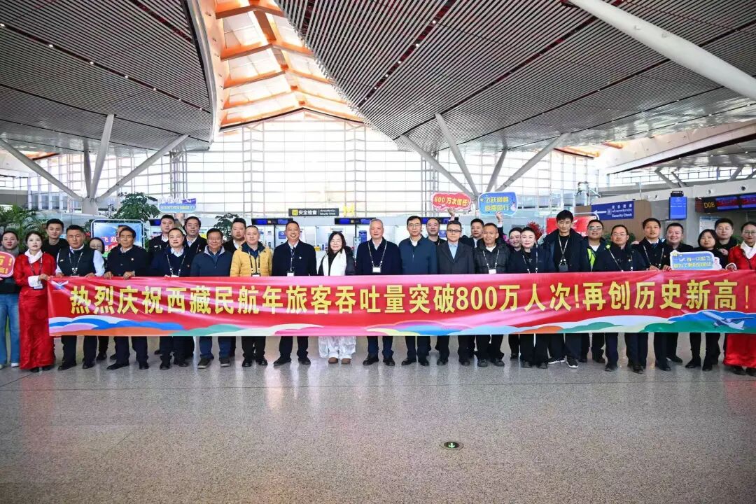圖為當(dāng)天在拉薩貢嘎國際機場抽取了第800萬名的幸運旅客與工作人員合影
