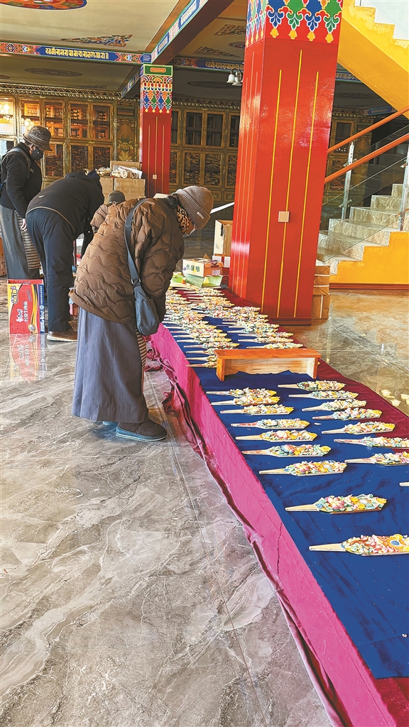 來到店內(nèi),一排排酥油花整齊陳列,蓮花、祥云、鯉魚等傳統(tǒng)圖案栩栩如生,細節(jié)精致,引得顧客頻頻駐足。上午10時許,已有不少市民慕名而來——有的通過社交平臺刷到,有的則是親友口口相傳的老顧客?!昂芏嗳嗣磕甓紩崆邦A(yù)訂?!钡赇佖撠?zé)人達瓦堅贊自豪地介紹,自從在社交網(wǎng)絡(luò)上宣傳后,訂單激增,制作酥油花的師傅們每天從早忙到晚,仍供不應(yīng)求。