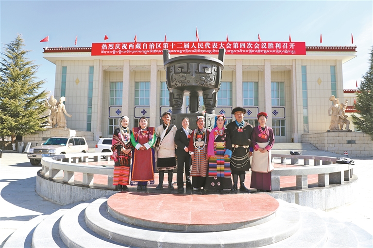 1月31日,來(lái)自7個(gè)民族的8位自治區(qū)人大代表,相“約”來(lái)到民族團(tuán)結(jié)寶鼎前,暢聊民族團(tuán)結(jié)進(jìn)步事業(yè)并合影,大家相約來(lái)年再聚。左起:玉珍(僜人)、次仁普只(門巴族)、加凳(藏族)、成海宏(漢族)、仁增(夏爾巴人)、仁青措珍(納西族)、達(dá)娃(珞巴族)、斗卓瑪(門巴族)。 西藏自治區(qū)人大宣傳中心 德吉曲珍 徐亮 攝