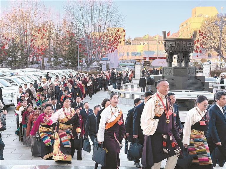 身著民族服飾的自治區(qū)人大代表步入會(huì)場(chǎng)。記者 次旦央吉 攝
