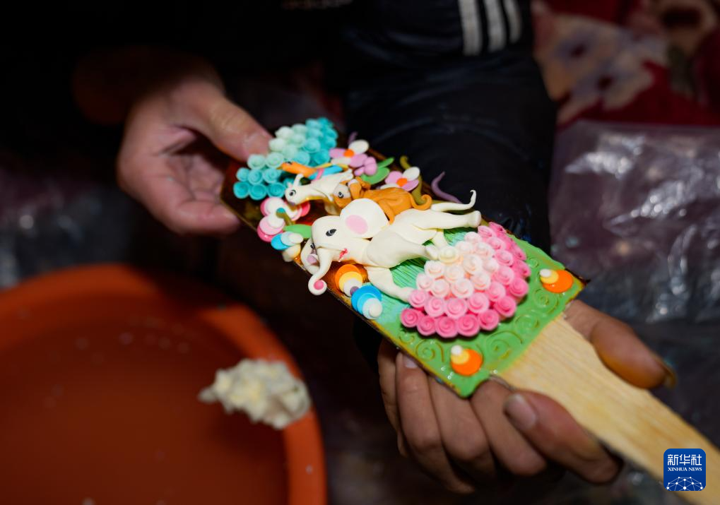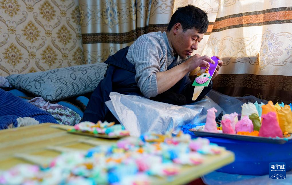 2月12日,在拉薩市林廓東路,來自西藏日喀則市仁布縣普松鄉(xiāng)的手工藝人羅布在制作酥油花。新華社記者 丁增尼達 攝