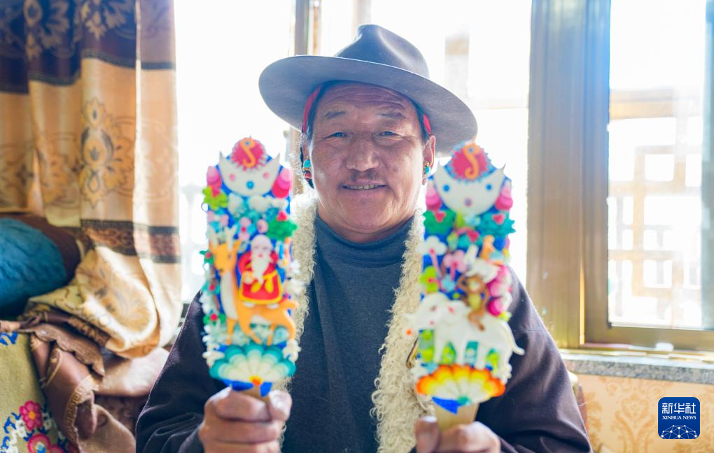 2月12日,在拉薩市林廓東路,來自西藏日喀則市仁布縣普松鄉(xiāng)的手工藝人羅布展示做好的酥油花。新華社記者 丁增尼達 攝