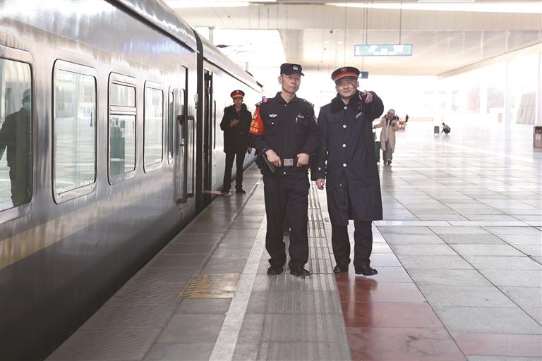 列車出發(fā)前,左紅彬(左)在站臺進(jìn)行安全檢查。通訊員 黃飛 攝