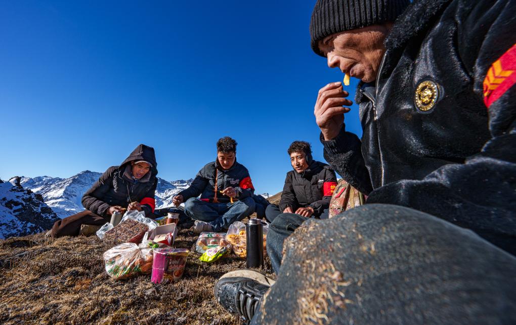 在西藏山南市隆子縣玉麥鄉(xiāng)境內(nèi),護(hù)邊員們在巡邏途中吃午飯。新華社記者 丁增尼達(dá) 攝