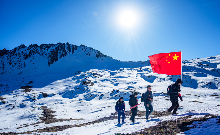 50歲的普布羅布單手舉著五星紅旗,走在隊伍最前面。索朗多吉不時用望遠(yuǎn)鏡看向更遠(yuǎn)處的雪線。“有沒有人越過邊境,裸露的石頭上有沒有他國的標(biāo)識物……這些都是巡邊要注意的事?!彼f。