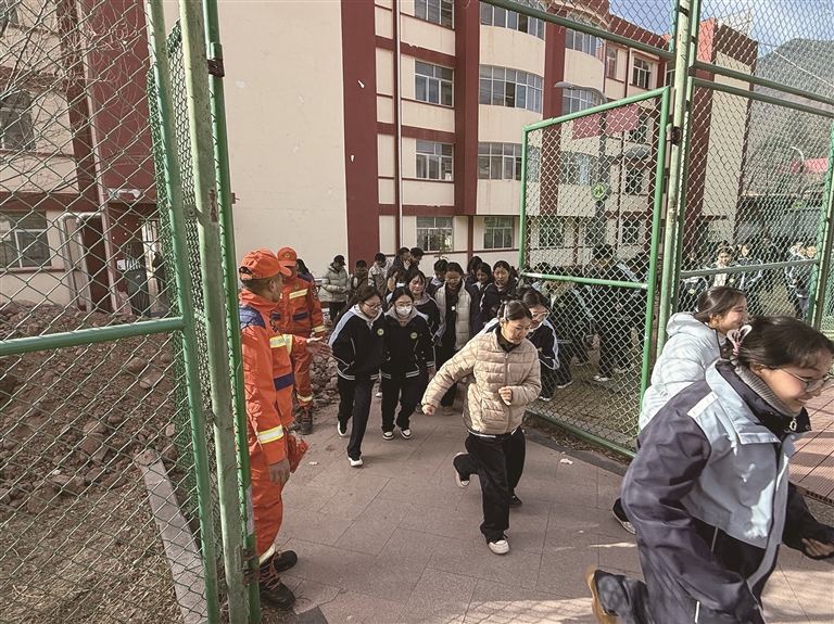 指戰(zhàn)員現(xiàn)場組織開展地震應急疏散演練。圖由卡若區(qū)消防救援機動大隊提供