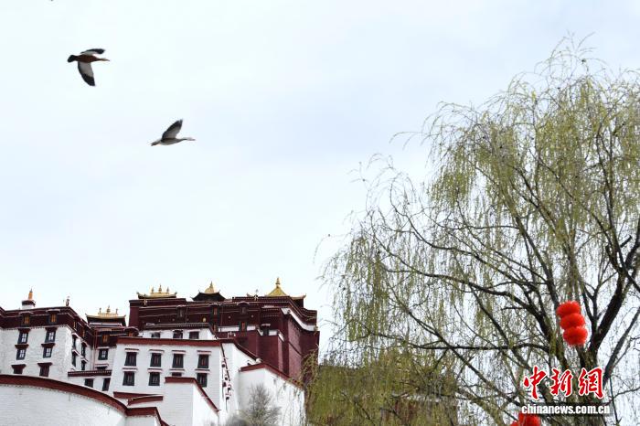 3月8日,西藏拉薩宗角祿康公園,楊柳吐綠。陽春三月,古城拉薩桃花初放、生機盎然,春意漸濃。中新社記者 貢嘎來松 攝