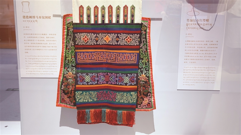 在藏北牧區(qū),婦女們佩戴的飾件“馬牙邦典”也別具一格。這種五彩圍裙上端,堆貼著豎條裝飾,形狀酷似馬的牙齒,故而得名。在這件展品的背后,還藏著一個家族兩代人對技藝的堅守與傳承,它不僅是裝飾品,更是牧區(qū)文化與情感的象征。