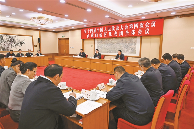 西藏代表團團長、自治區(qū)黨委書記王君正主持并講話。西藏代表團副團長、自治區(qū)黨委副書記、自治區(qū)人大常委會主任嚴金海,西藏代表團副團長、自治區(qū)黨委副書記、自治區(qū)主席嘎瑪澤登參加。