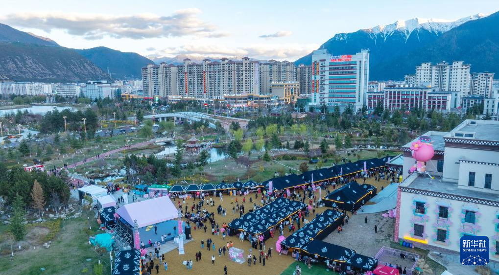 這是4月3日拍攝的林芝第二十三屆桃花旅游文化節(jié)“堆春行動(dòng)”集市現(xiàn)場(chǎng)(無(wú)人機(jī)照片)。新華社記者 丁增尼達(dá) 攝