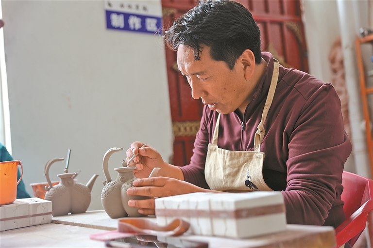 公司實行“按勞計酬”的薪酬制度,為員工提供了穩(wěn)定的收入保障。這份“家門口”的可觀收入,讓員工們穩(wěn)穩(wěn)撐起了家庭的幸福生活。“以前在家種地,收入不穩(wěn)定,現(xiàn)在在公司做黑陶,不僅學到了一門手藝,每個月還有固定工資,日子越過越有盼頭了!”作為曲珠的第一批學生,扎西如今已能獨立設計制作復雜的黑陶茶具,月薪穩(wěn)定在5000元左右,他的感慨道出了所有員工的心聲。這些扎根鄉(xiāng)土的手藝人,不僅用雙手改變了生活,更因?qū)@門技藝的熱愛與堅守,成為察雅黑陶傳承路上的重要力量。