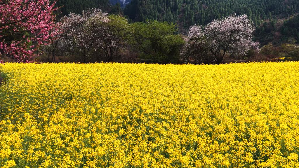 西藏林芝市波密縣易貢鄉(xiāng),油菜花與桃花迎春綻放。新華社記者 普布次仁 攝