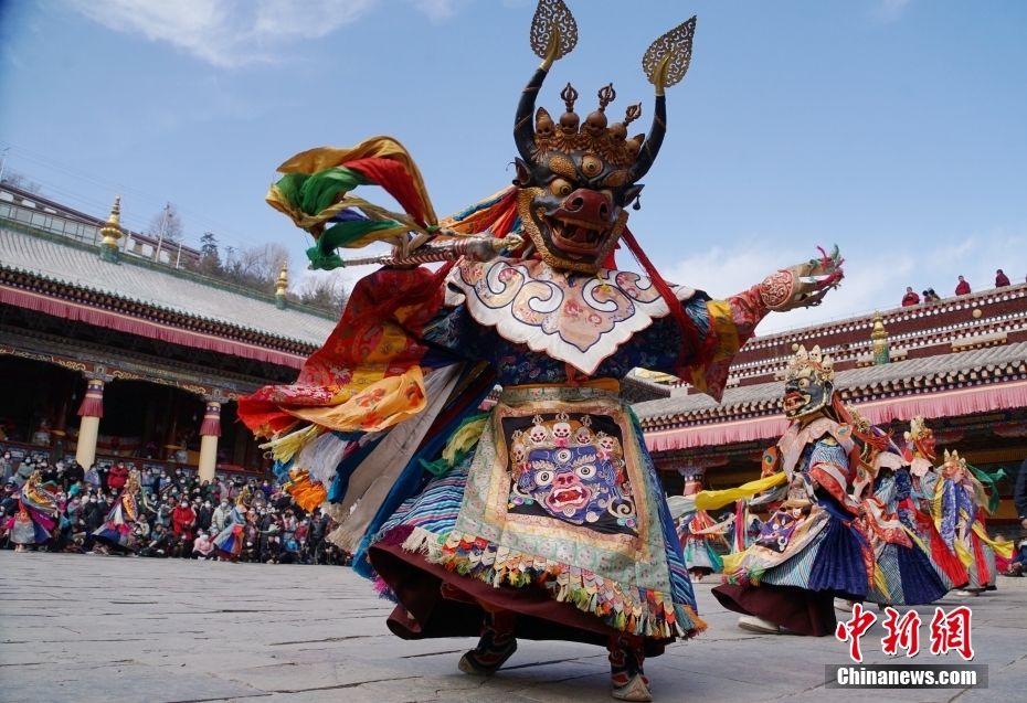 2月4日12時許,在藏傳佛教名剎塔爾寺,伴隨著低沉延綿的法號和鼓鈸節(jié)奏,藝僧們頭戴各種金剛、神獸面具,手持降妖伏魔的千般法器涌向500多平方米的九間殿院子,可追溯史超過280年的塔爾寺“跳欠”儀式開始,整個院子觀者如堵。