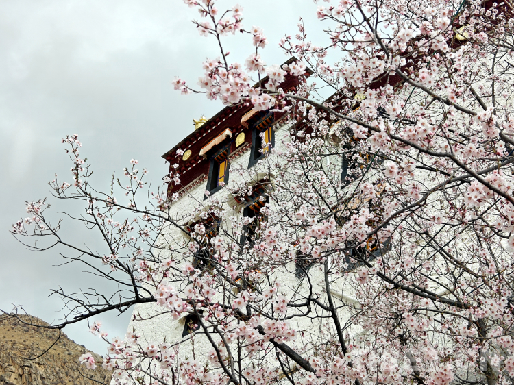 圖為帕邦喀古建筑與桃樹同框的畫面