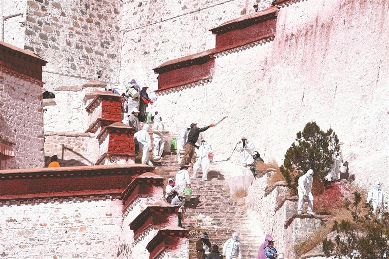 10月22日,拉薩布達(dá)拉宮迎來一年一度的粉刷季,人們手持工具,將涂料逐層涂刷在布達(dá)拉宮墻上。據(jù)了解,布達(dá)拉宮刷墻涂料主要以白灰、紅土和黃土等天然原料為主,為了增加光澤和黏度,調(diào)配過程中還會添加少量的牛奶、白糖、蜂蜜、藏紅花和牛骨膠等,讓涂料更好地附著在墻體上,為布達(dá)拉宮的墻體增添一層保護(hù)。記者 洛桑 唐斌 攝影報道