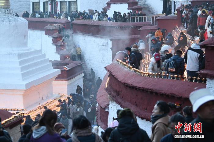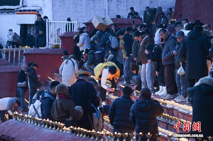 圖為信眾在甘丹寺內(nèi)點酥油燈。 中新社記者 貢嘎來松 攝