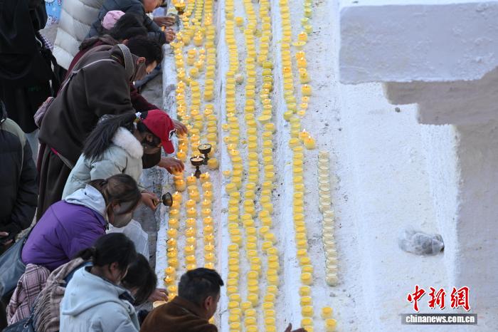 圖為信眾在甘丹寺有序擺放酥油燈。 中新社記者 貢嘎來松 攝