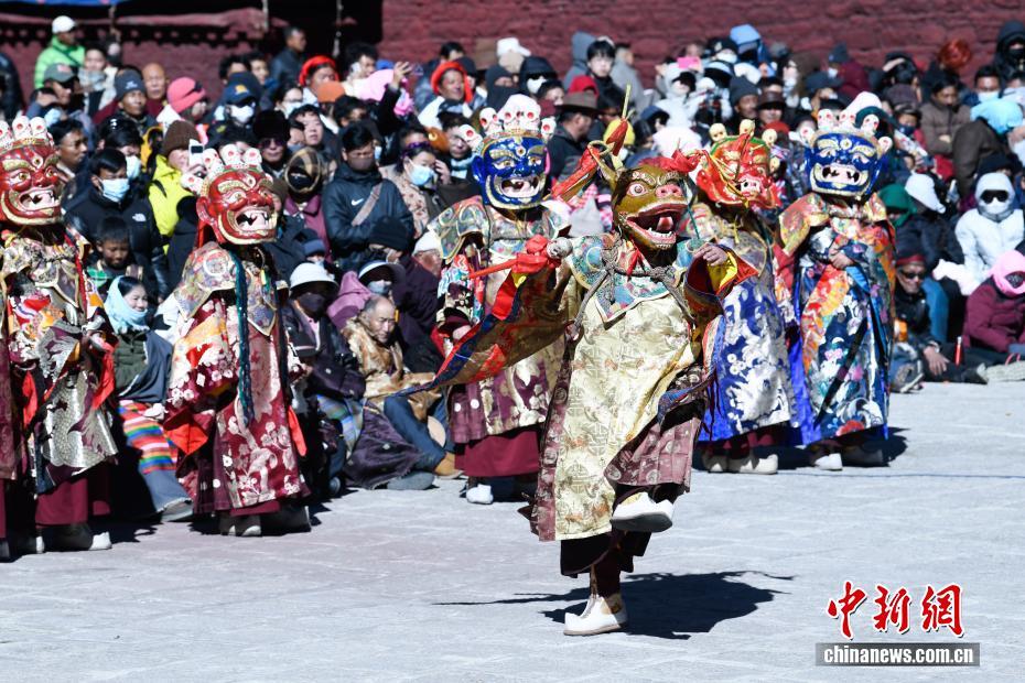 2月16日,西藏楚布寺舉行“羌姆”表演。當(dāng)日,是藏歷十二月二十九日,西藏楚布寺舉行“羌姆”表演迎藏歷新年。圖為楚布寺僧人們佩戴面具表演。中新社記者 貢嘎來松 攝