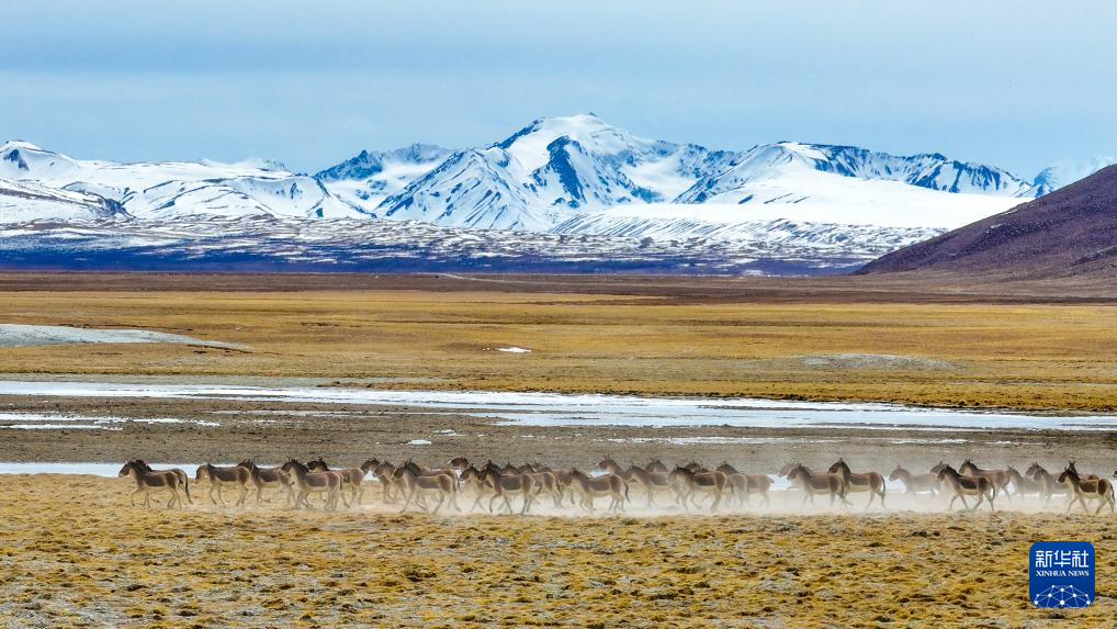 3月29日,藏野驢在西藏阿里地區(qū)普蘭縣境內(nèi)雪山下奔跑(無人機(jī)照片)。新華社發(fā)(劉曉東攝)