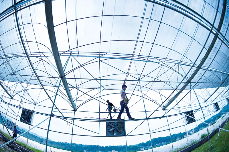 近年來(lái),湖北省恩施土家族苗族自治州宣恩縣大力發(fā)展“設(shè)施農(nóng)業(yè)”,通過(guò)企業(yè)、合作社、家庭農(nóng)場(chǎng)等將農(nóng)民手中的土地進(jìn)行流轉(zhuǎn),發(fā)展農(nóng)業(yè)觀光園和生態(tài)采摘園,為當(dāng)?shù)剞r(nóng)民開(kāi)辟一條產(chǎn)業(yè)脫貧的新路。圖為宣恩縣李家河鎮(zhèn)二虎寨村,工人們?cè)诖罱乜卮笈铩?新華社記者 宋文/攝