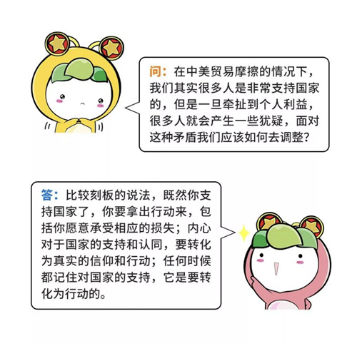 面對短期的困難和波動,青年人要清楚“美國在貿(mào)易戰(zhàn)中提出的要價,不是小打小鬧”,應(yīng)該堅定立場,“抗?fàn)幍降住?,也要“風(fēng)物長宜放眼量”,避免局限于眼前的小確幸,被暫時的挫折和困難所擊倒,要有與國家民族的發(fā)展同方向的扎實的行動,在實踐中實現(xiàn)自我價值。