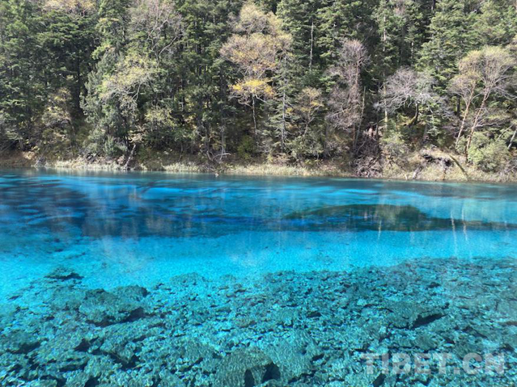 圖為五花海,由于海底的鈣華沉積、各種色澤艷麗的藻類以及岸邊五彩斑斕的林木倒影,使得五花海呈現(xiàn)出鵝黃、藏青、墨綠、寶藍等顏色,故稱“五花?!?,素有“九寨精華”之譽