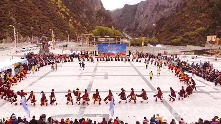 圖為江達(dá)縣崗?fù)墟?zhèn)紅旗廣場(chǎng)上表演的昌都百人大鍋莊