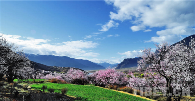 雪山、桃樹、青稞、經(jīng)幡,白色、紅粉、青蔥與五顏六色,色彩的對(duì)比,與相互襯托,一個(gè)立體的桃花谷,矗立在波密的山水間。