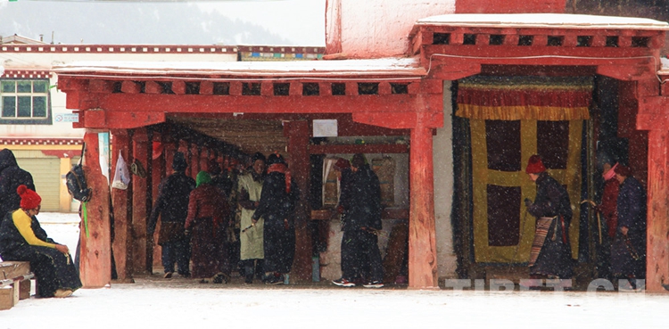 類烏齊寺已有700多年歷史,查杰瑪大殿為類烏齊寺主體建筑,坐西朝東,建筑主體呈四方形,高48米、建筑面積3000余平方米,造型獨(dú)特,宏偉莊嚴(yán),無(wú)論外觀,還是內(nèi)部形制,都巧妙地融合了中國(guó)藏式、漢式以及尼泊爾建筑風(fēng)格。大殿高三層,層層收攏,一層為厚約2米的土墻,外涂紅、白、黑三色豎形條紋,因此又被稱為“花殿”。圖為冰天雪地中的類烏齊寺查杰瑪大殿 攝影:鄭朔
