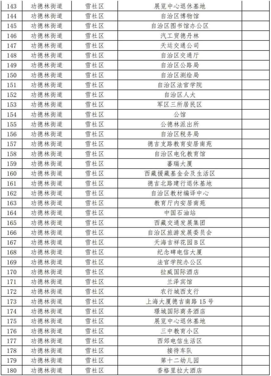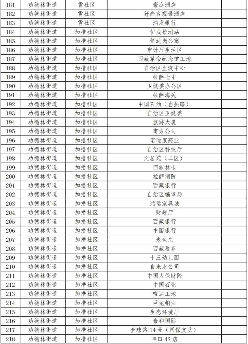 17.功德林街道加措社區(qū)(伊成檢測站、箭達(dá)崗公寓、審計(jì)廳生活區(qū)、西藏革命紀(jì)念館工地、自治區(qū)血液中心、拉薩七中、衛(wèi)健委辦公區(qū)、拉薩海關(guān)、中國石油(當(dāng)熱路)、自治區(qū)衛(wèi)健委、旅游大廈、南方公司、諾迪康藥業(yè)、自治區(qū)科技廳、文居苑(二區(qū))、回族林卡、拉薩消防、西藏銀行、自治區(qū)編譯局、鴻運(yùn)家具城、財(cái)政廳、西藏銀行、中國銀行、老魚莊、西藏稅務(wù)、十三幼兒園、自來水公司、中國人保財(cái)險(xiǎn)、中國石化、哈達(dá)工地、巨龍銅業(yè)、生態(tài)環(huán)境廳、泰和國際、金珠路14號(國保支隊(duì))、豐田4S店、110便民支隊(duì)、第三安居苑、財(cái)經(jīng)學(xué)院、農(nóng)銀大學(xué)、圣州加氣站、錦江之星酒店、自治區(qū)衛(wèi)校、拉薩市農(nóng)行退休基地、財(cái)康青年旅社、甘丹寺招待所、西藏自治區(qū)疾控中心第二工作區(qū)、拉薩市運(yùn)管局、尼泊爾領(lǐng)事館、加措社區(qū)居委會、金陵酒店、澤當(dāng)飯店、環(huán)球大廈、區(qū)工人療養(yǎng)院、交警總隊(duì)、銀都賓館);