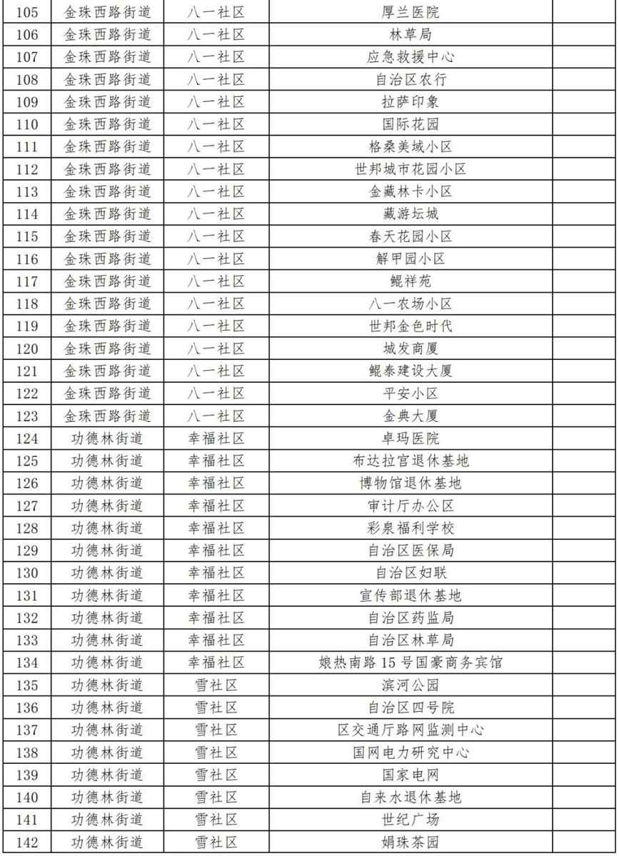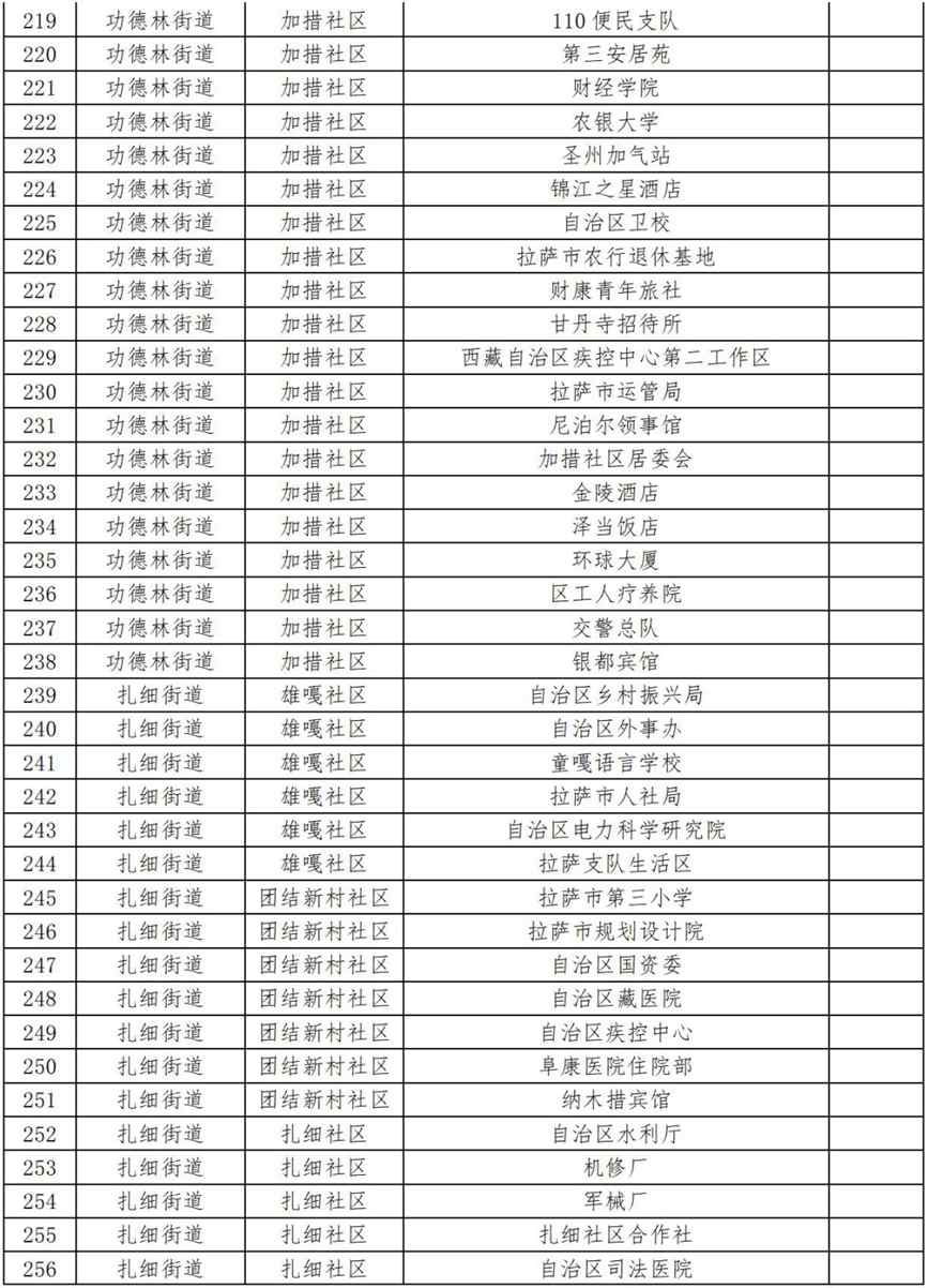 19.扎細(xì)街道團(tuán)結(jié)新村社區(qū)(拉薩市第三小學(xué)、拉薩市規(guī)劃設(shè)計(jì)院、自治區(qū)國資委、自治區(qū)藏醫(yī)院、自治區(qū)疾控中心、阜康醫(yī)院住院部、納木措賓館);
