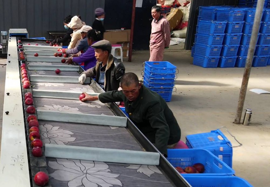 走進(jìn)果園,昔日凹凸不平的塊狀農(nóng)田上,整齊排列的果樹一眼望不到頭,枝頭上的蘋果更是一茬接一茬的生長,有的深紅、有的淺紅、有的還泛青、有的則包著保護(hù)袋等待采摘,它們沉甸甸的,是果農(nóng)們致富的現(xiàn)實圖景。幾十名當(dāng)?shù)卮迕裾诠麍@里忙碌著,有的在清除雜草、有的在采摘、有的在做防護(hù),分工有序,干勁十足。