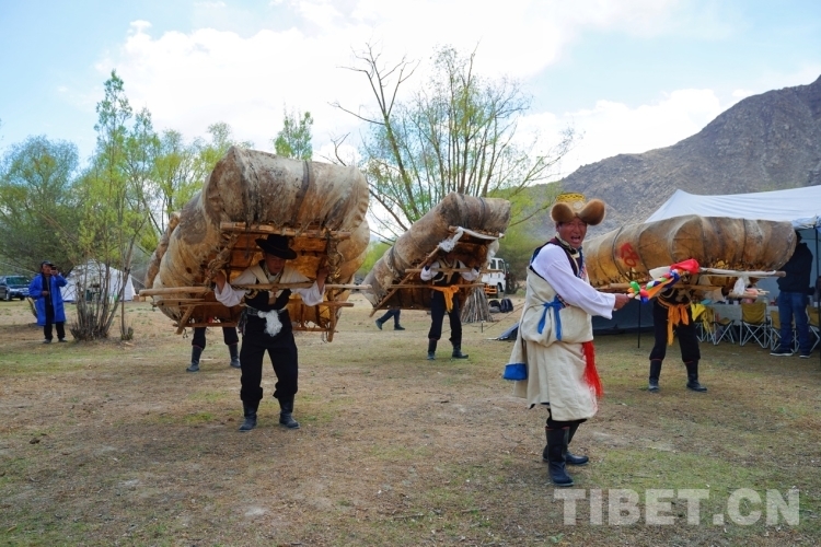當(dāng)天恰好是周六,從拉薩來體驗的游客不在少數(shù),有的是觀看了抖音直播就馬上騎車過來體驗的。在營地,大家欣賞到了當(dāng)?shù)氐摹肮挝琛保ㄅFご瑁?,廓孜由邊唱邊跳的“阿熱”和身背牛皮船跳舞的“船夫”合作表演?!鞍帷笔枪挝柚械念I(lǐng)舞者,跳牛皮船舞時,“阿熱”手執(zhí)“塔塔”(五彩旗桿),唱著歌,跳著舞,另外4位舞者看著“阿熱”的動作,背著重約80斤的牛皮船,用同樣的動作跟著“阿熱”跳舞。大家動作整齊,船漿擊打船舷的“咚咚”聲不絕于耳。