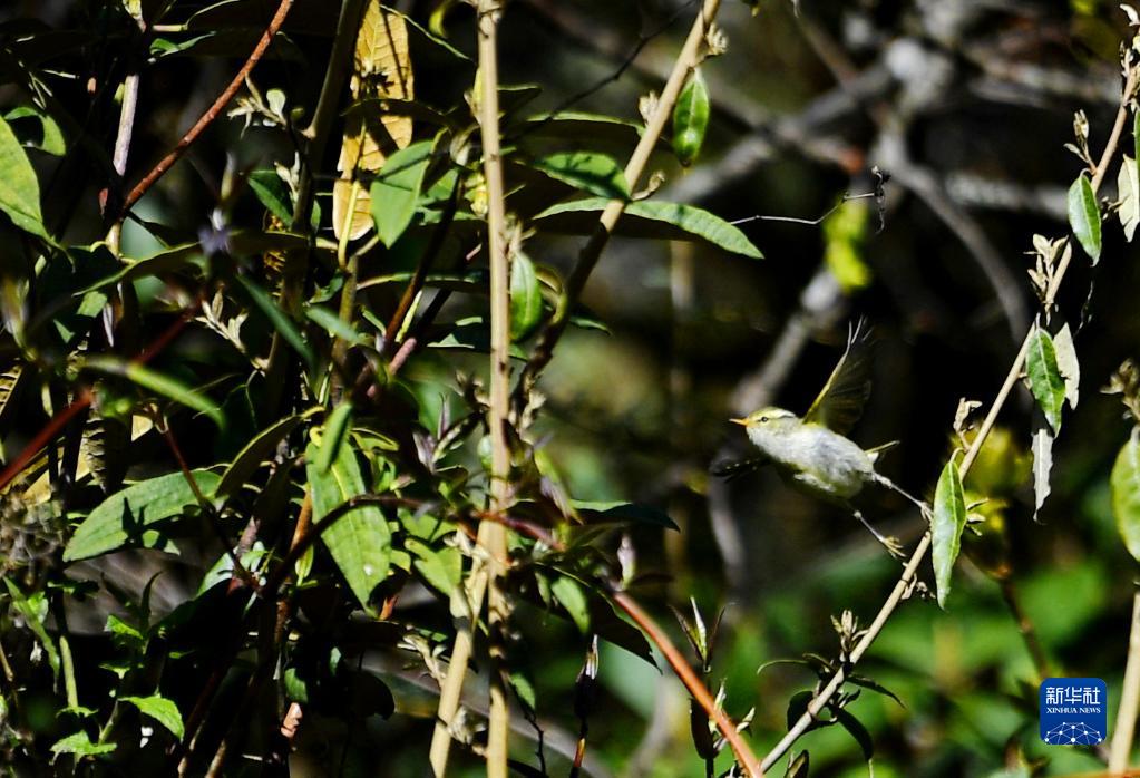 一只柳鶯在樹枝間飛行(4月24日攝)。新華社記者 張汝鋒 攝