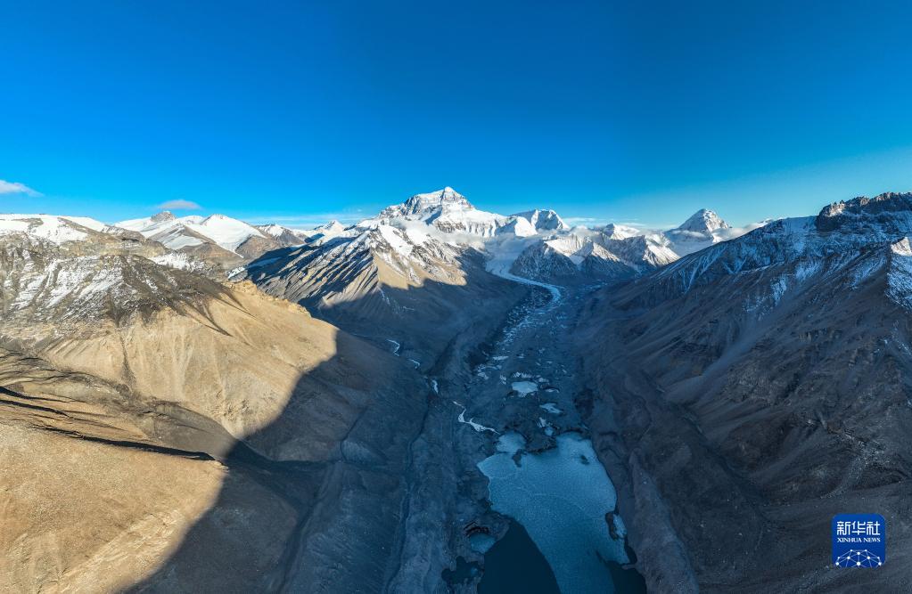 這是珠峰腳下的中絨布冰川(前)和西絨布冰川(后)(5月15日攝,無人機照片)。新華社記者 孫非 攝