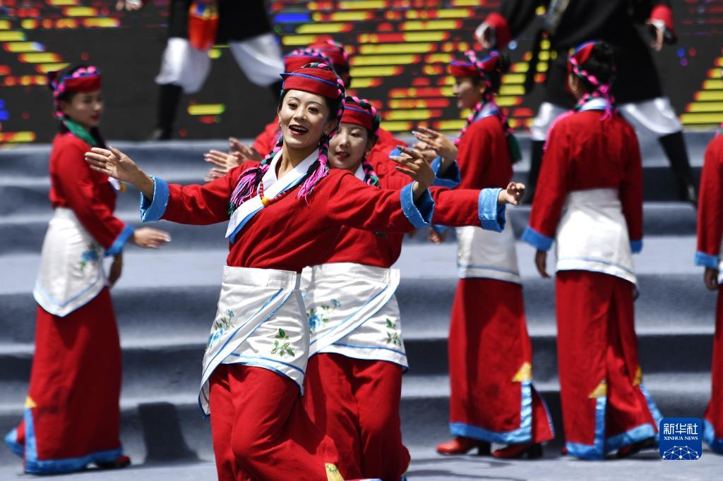 5月28日,演員在米林市第十五屆黃牡丹藏醫(yī)藥文化旅游節(jié)開幕式上表演節(jié)目。新華社記者 張汝鋒 攝