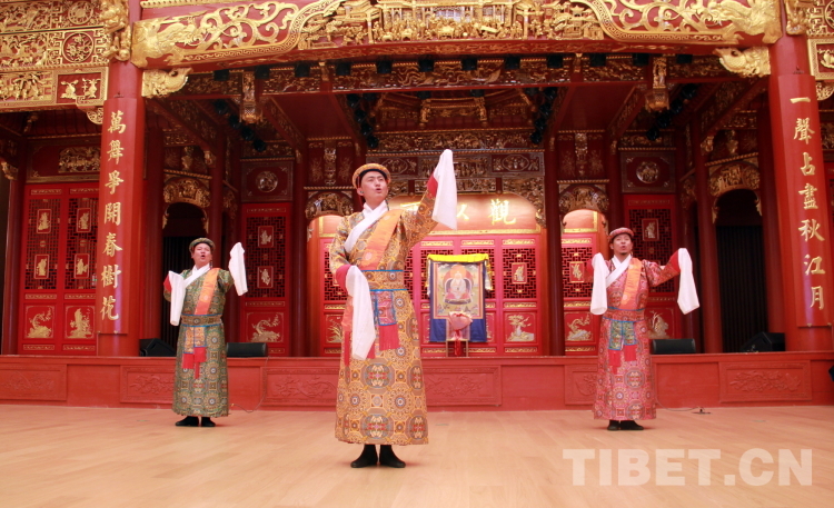 圖為拉薩市城關(guān)區(qū)娘熱民間藝術(shù)團(tuán)演員表演國(guó)家級(jí)非物質(zhì)文化遺產(chǎn)“嘎爾”攝影:劉莉