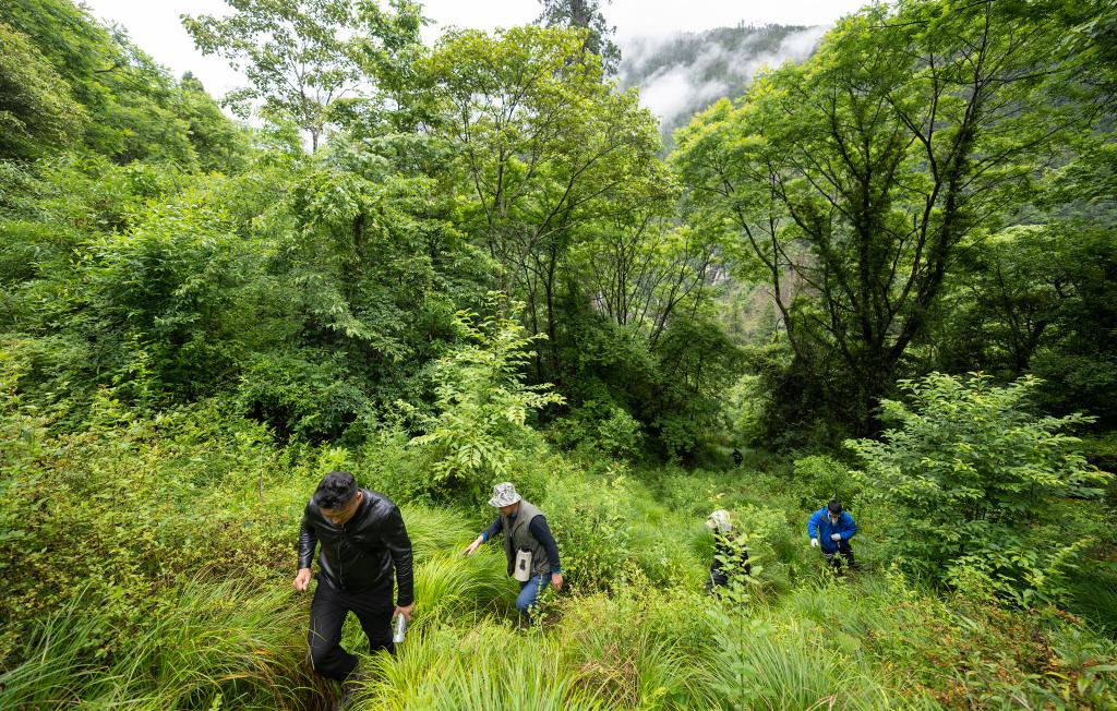 索朗次仁在查看家鄉(xiāng)的西藏柏木,今年5月,就是在他的帶領(lǐng)下,來(lái)自北大的科研人員發(fā)現(xiàn)了亞洲第一高樹(shù)(6月15日攝)。