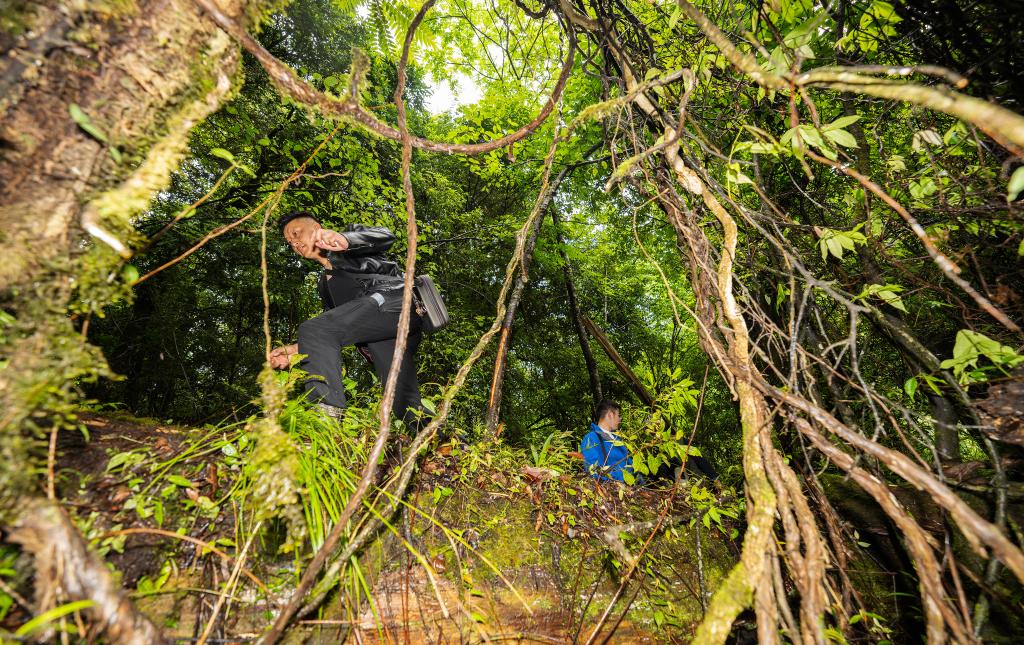 6月15日,波密縣林草局工作人員西繞(左)帶領(lǐng)大家穿過(guò)原始森林尋找亞洲第一高樹(shù)。