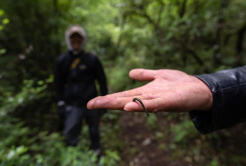 6月15日上午,“國(guó)道之行 從雪山奔向大?!眻?bào)道組在波密縣林草局工作人員西繞的帶領(lǐng)下,開(kāi)啟了尋找亞洲第一高樹(shù)的旅程。西繞此前已經(jīng)三次到達(dá)過(guò)亞洲第一高樹(shù)所在地,對(duì)路線非常熟悉。前一天他提醒我們,這一路翻山越嶺非常不好走,而且原始森林中螞蟥很多,更有可能遇到蛇。波密縣林草局副局長(zhǎng)尼瑪次仁也囑咐我們要注意安全。因?yàn)樯鷳B(tài)保護(hù)得好,林芝地區(qū)最近幾年野生動(dòng)物的數(shù)量和種類(lèi)都大幅增加,森林中不僅有金錢(qián)豹、云豹、猞猁,更出現(xiàn)了雪豹的蹤跡?!靶?,尤其是熊,特別多!”尼瑪次仁對(duì)我們說(shuō)。