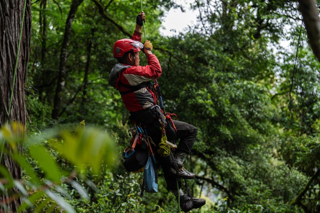 “我今天主要是兩項(xiàng)工作,第一個(gè)叫做攀樹(shù)的先鋒掛繩,就是把兩根攀樹(shù)的主繩掛到90米左右的一個(gè)高點(diǎn);第二件事情是在我的攀登以及下降的過(guò)程中,給鐘老師、王孜博士,每隔5米,采集少量的葉片和附生植物,他們會(huì)拿回實(shí)驗(yàn)室做一些分析對(duì)比?!?/p>