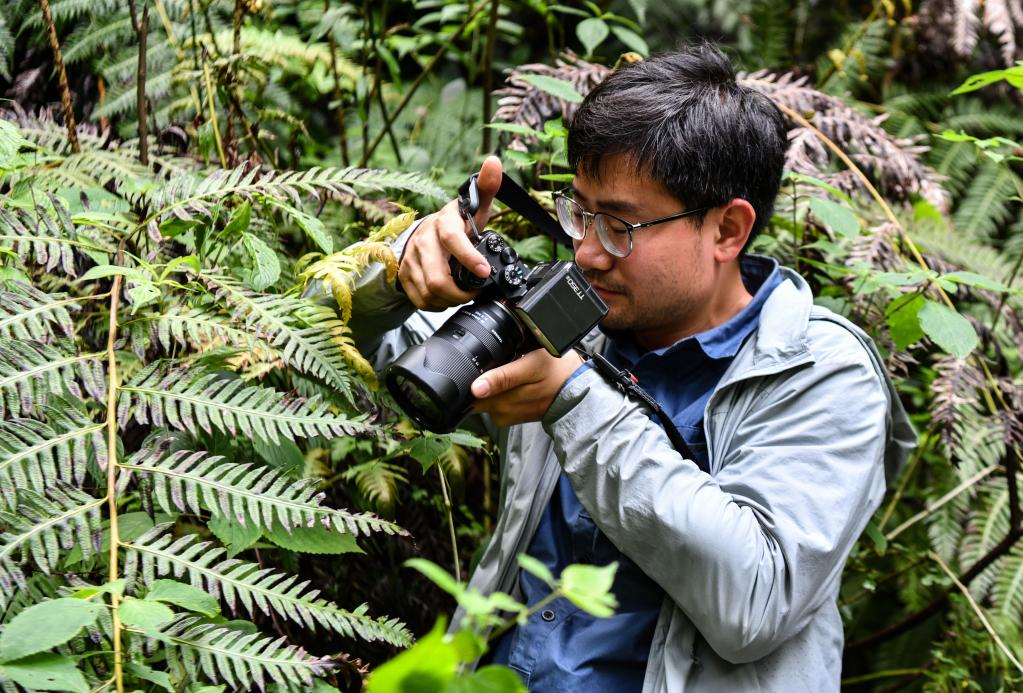 6月15日,中國(guó)科學(xué)院植物研究所博士研究生王孜在亞洲第一高樹(shù)旁拍攝一株西藏柏木的小樹(shù)苗。