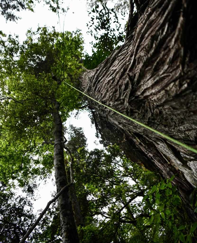 巧了,真是巧了!居然能在這里遇到國(guó)家重要野生植物種質(zhì)資源庫(kù)辰山中心負(fù)責(zé)人鐘鑫和中科院植物所博士生王孜。而王孜正是此前察隅縣83.2米的云南黃果冷杉發(fā)現(xiàn)團(tuán)隊(duì)的主要成員。此時(shí),鐘鑫正在亞洲第一高樹(shù)后面十多米的另外一棵巨樹(shù)上進(jìn)行生物調(diào)查,那棵樹(shù)的高度與亞洲第一高樹(shù)相近,但是狀態(tài)更好,更年輕。而王孜博士則在等待劉團(tuán)璽將攀樹(shù)的主繩掛到亞洲第一高樹(shù)90米左右的位置后,上樹(shù)進(jìn)行生物調(diào)查。