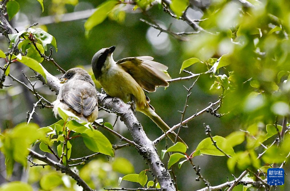 一只伯勞(右)和幼鳥在拉薩市城關(guān)區(qū)一處庭院的樹枝上(7月28日攝)。新華社記者 張汝鋒 攝